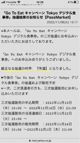 本日Yahooメールにて連絡がきました。 厳正なる抽選の結果、落選・・・しました。 ちなみに同時に申し込んだ友人は当選したそうです。一緒にいく食事会で使ってくれる予定なので、ひとまず良かった~感謝カンシャ!というのと、自分は落選で落ち込むのと・・…