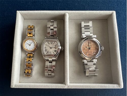 仕事をしていた時に使っていた時計たち フェイスが大き目のものが好きでどれもとても気に入ってました。 一番左のエルメスは亡くなった母が愛用していた物。形見となりました。 30代の頃、私にはゴールドが似合わずあまりつけなかったけど(^^;年を経るにつれ…